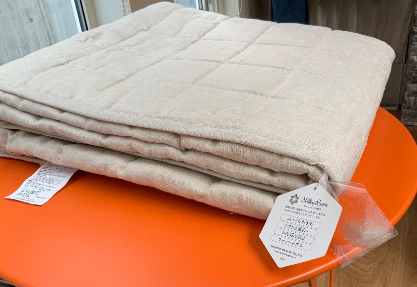 表地にリネンを使用しました。高級なラミーわたをたっぷり使用し、しっかりとベッドパッドとして使用するボリューム感を持たせています。高級感のある200マスのキルト「スクエア200S」を採用しています。