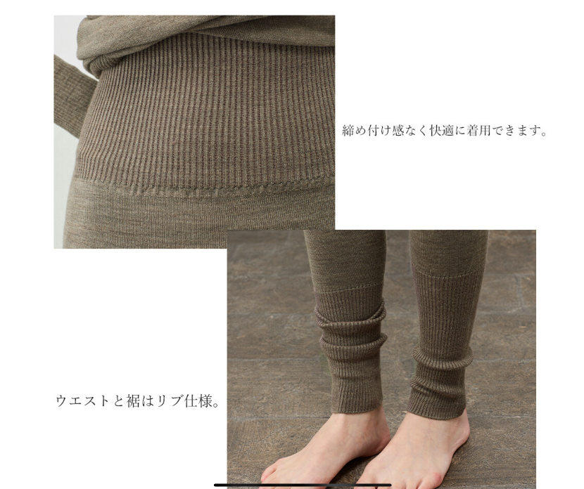 肌に触れる内側はシルク、外側は柔らかく保温性が高いウールを使用した秋冬向けのレギンスです。シルクは汗を吸収し、しっとりしたやさしい風合いになり、外側のウールは柔らかく保温してくれます。冬の寒さから守ってくれるレギンスです。